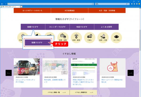 トップページの「組織でさがす」をクリックすると、野々市市の組織一覧ページが表示されます。