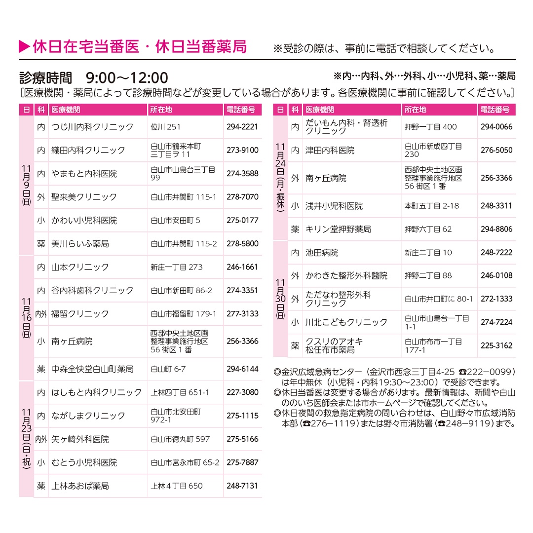 - 11月9日から11月30日の休日当番医・休日当番薬局 [その他のファイル/340KB]