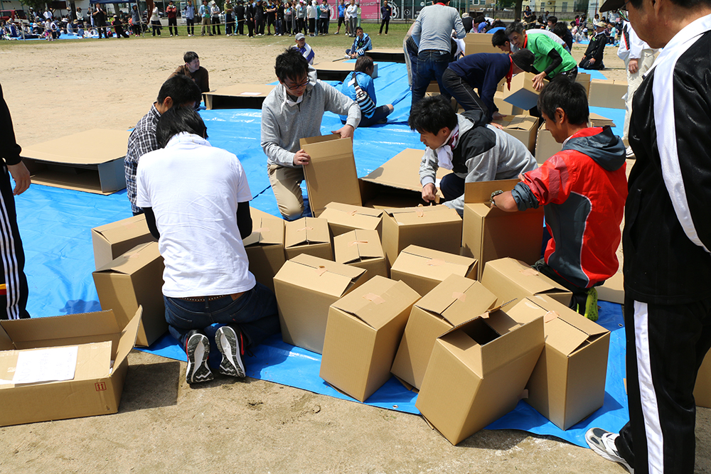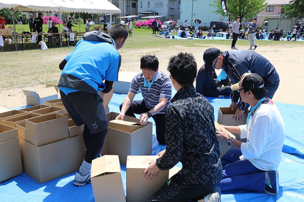 5月7日(日曜日)に開催された第39回粟田町内運動会で、災害時に使用する段ボールベッドを用いた防災競技が行われました。「イベントの一部として楽しみながら防災を学んでほしい」という主催者の思いから、今回初めて防災競技を取り入れました。